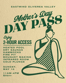 The Mother’s Day Wellness Day Pass includes full access to our heated pool, two Scandinavian-style dry saunas, infrared light room, cold plunge bucket, hammocks, and fire pit. Everything she needs to exhale, reset, and just be. Valid for a 2-hour window between 11 AM and 4 PM. Day Pass guest is invited to create their own mini flower bouquet at our DIY Flower Bar.